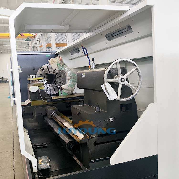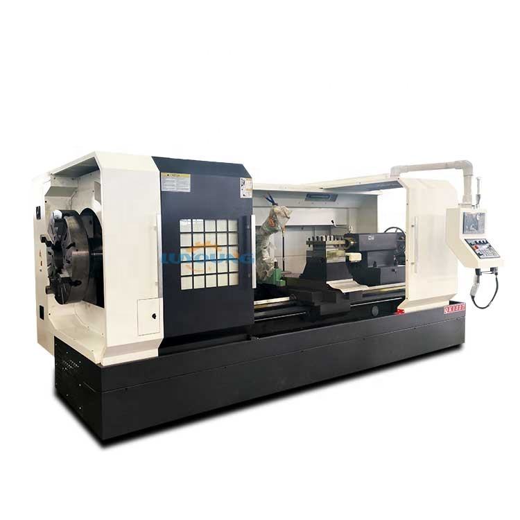 QK1332 High Performance Pneumatic chuck CNC Lathe Pipe Thread Manufacturing Machine on the spindle box, and the workpiece passes through the through-hole and is clamped by two chucks located at both ends of the spindle for rotary motion. There are generally two ways to feed the cutting tool: one is to drive the slide plate and tool holder located in front of the bed by the screw, which is the same as that of a regular lathe; Another method is to use a flat comb blade external thread cutting head (see automatic opening and closing thread cutting head) located on the slide plate in the center of the bed to cut into the workpiece and move forward accordingly. Some machine tools for processing long pipes also come with workpiece support devices, such as center frames, follower frames, rear supports, etc.